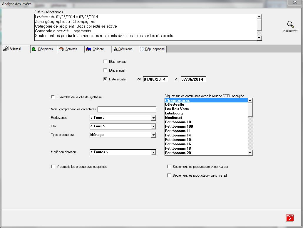 On peut rechercher les producteurs de déchets présentant un litrage très important, ou au contraire très faible, à la collecte. Combinée avec l'analyse des taux de présentation ou des suivis sur le terrain par exemple, cette sélection permet de détecter des anomalies et de procéder aux ajustements nécessaires.