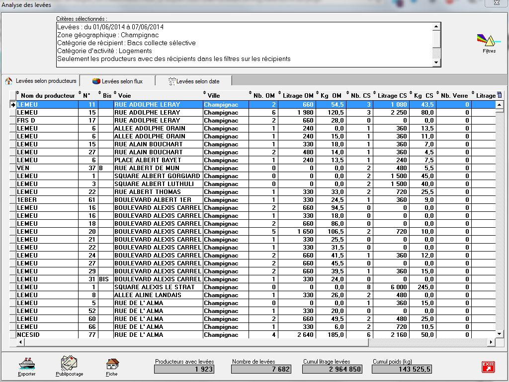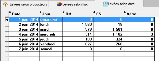 Comptages : nombre de producteurs concernés, nombre de levées, litrage théorique et poids levés (s'affichent sur les trois onglets)