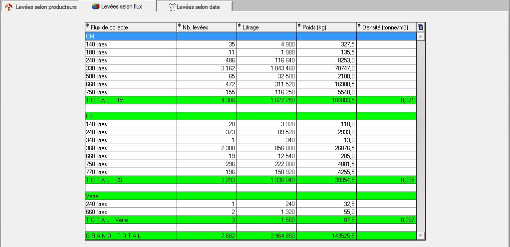 Levées par flux de collecte : Nombre de récipients, litrage théorique, poids collecté
