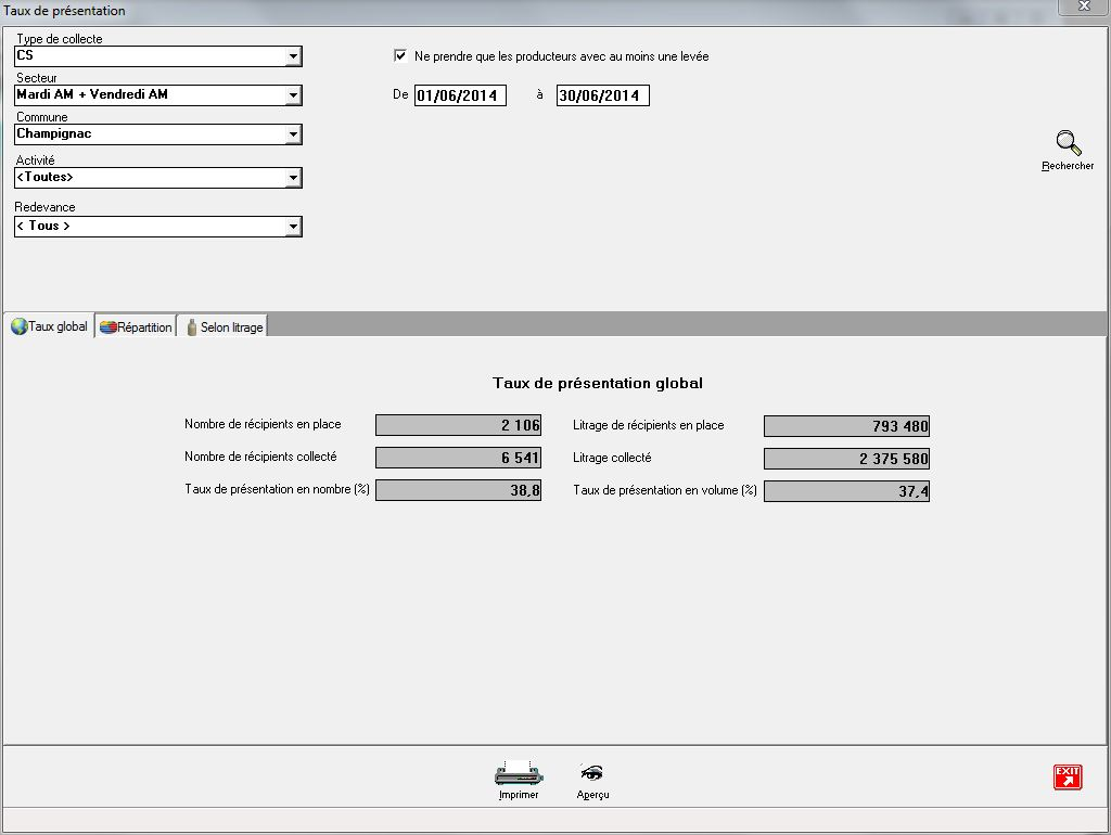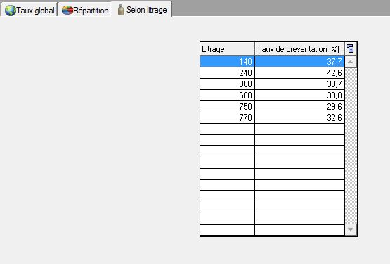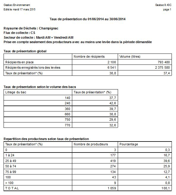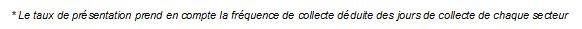 Le taux de présentation représente, en pourcentage, le nombre moyen de fois où un récipient est présenté à la collecte. Un récipient vidé à chaque passage du véhicule de collecte aura un taux de 100%, 50% s'il ne l'est qu'une fois sur deux, 25% une fois sur quatre, etc.