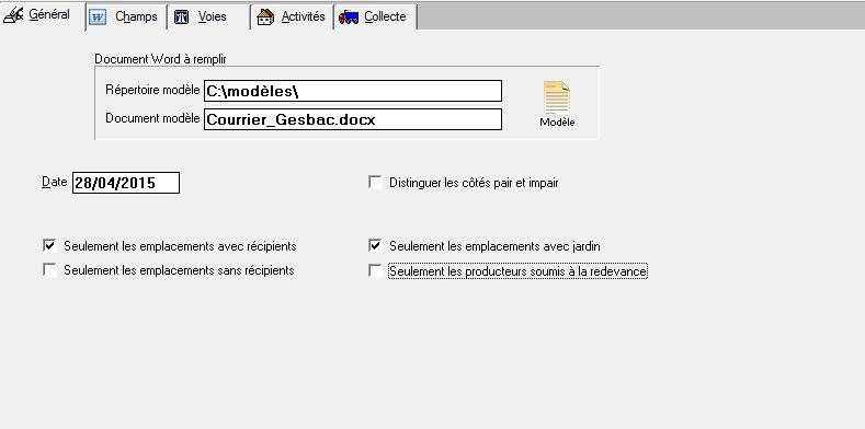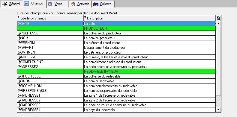 Les champs proposés sont des variables qu'il est possible d'insérer dans un modèle de document Ms-Word. Lors de la génération du publipostage, ils seront remplacés par les valeurs correspondantes lues dans la base de données de GESBAC.