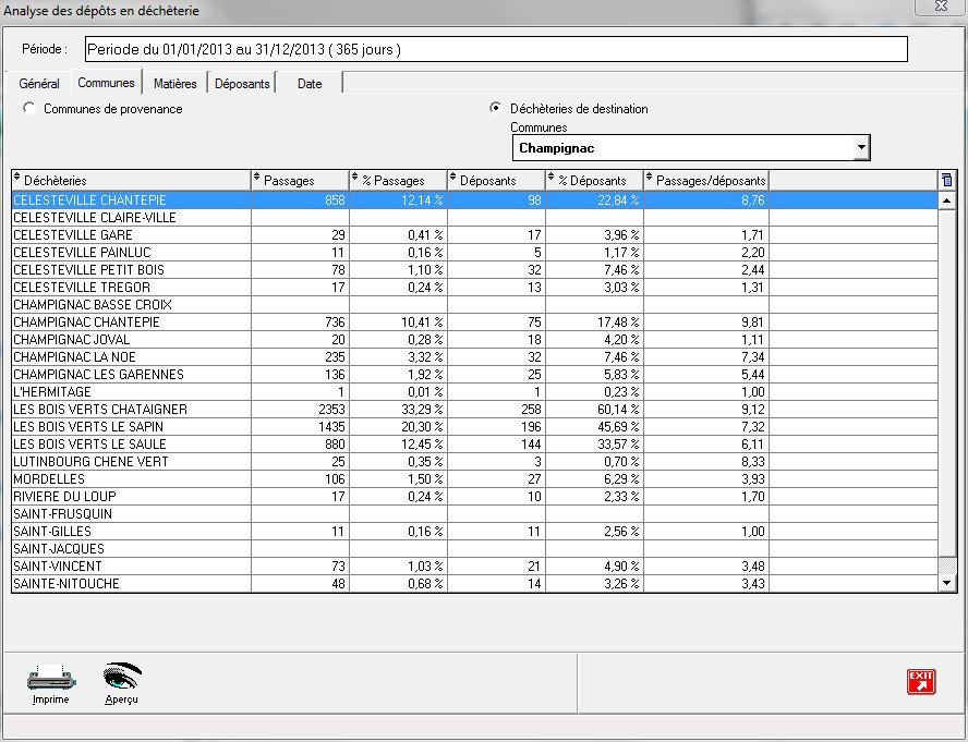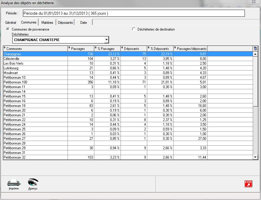 On étudie ici la fréquentation des déchèteries en fonction des communes de provenance des déposants.