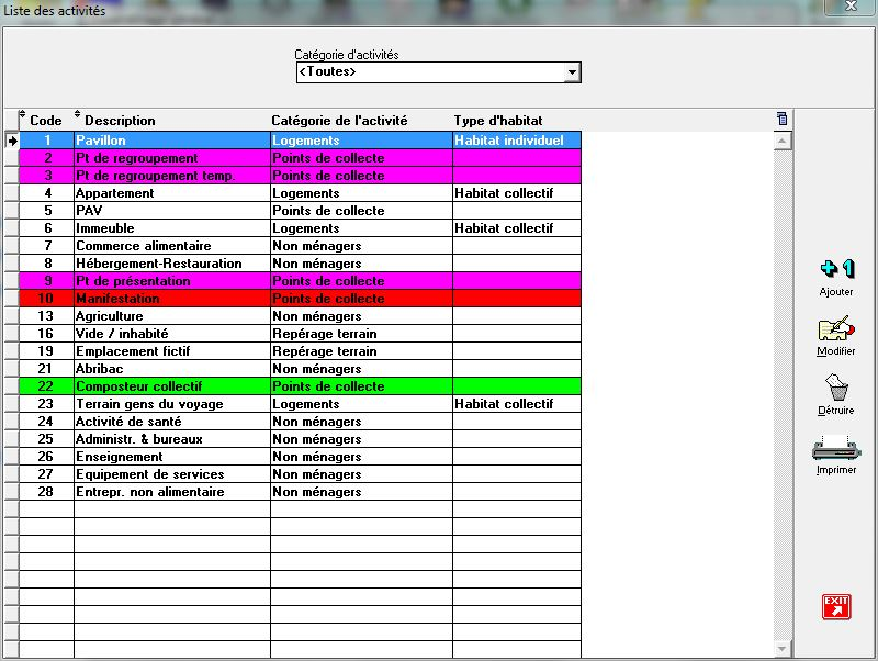 On entend par activité, le terme qui caractérisel'emplacementassocié à un producteur de déchets, par exemple habitation individuelle, commerce alimentaire, établissement d'enseignement, bureau, etc.