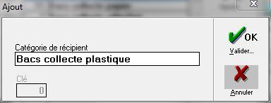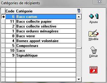 Une catégorie est un regroupement de récipients partageant des caractéristiques communes, généralement appartenant à un même flux de collecte (ordures ménagères, verre, collecte sélective, etc.).