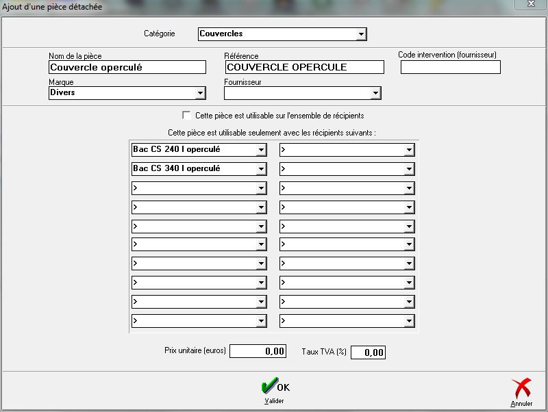 Taux TVA (%) : taux de TVA applicable à la pièce détachée
