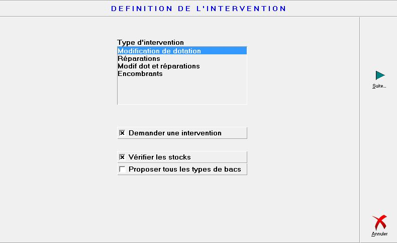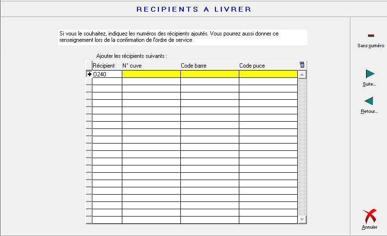 Pour chaque récipient, si on en a déjà connaissance, on peut saisir ici les identifiants (numéro de cuve, code barre, code puce) du récipient, ou indiquer qu'il n'en possède aucun en cliquant sur le bouton « Sans numéro » (raccourci-clavier<Alt><n>). Comme il s'agit d'une demande d'intervention, ces identifiants ne sont pas supposés connus et seront notés sur le terrain, puis renseignés lors de la validation de l'ordre de service.