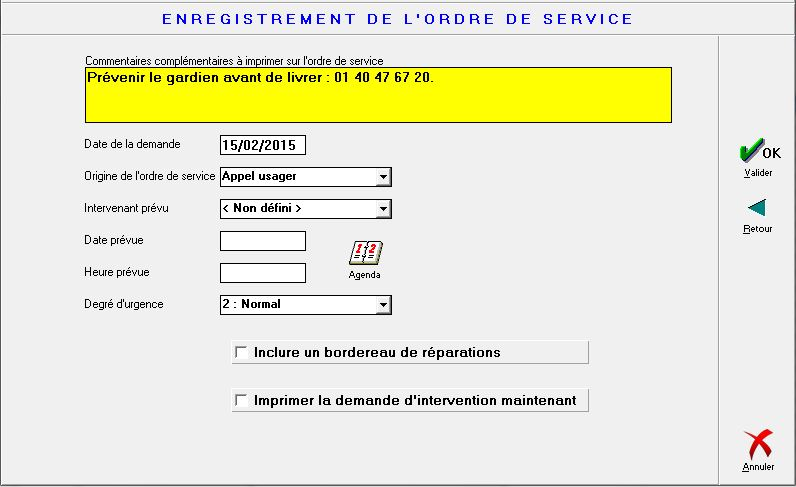 Commentaire complémentaire : précisions éventuelles (seront imprimées sur l'ordre de service)