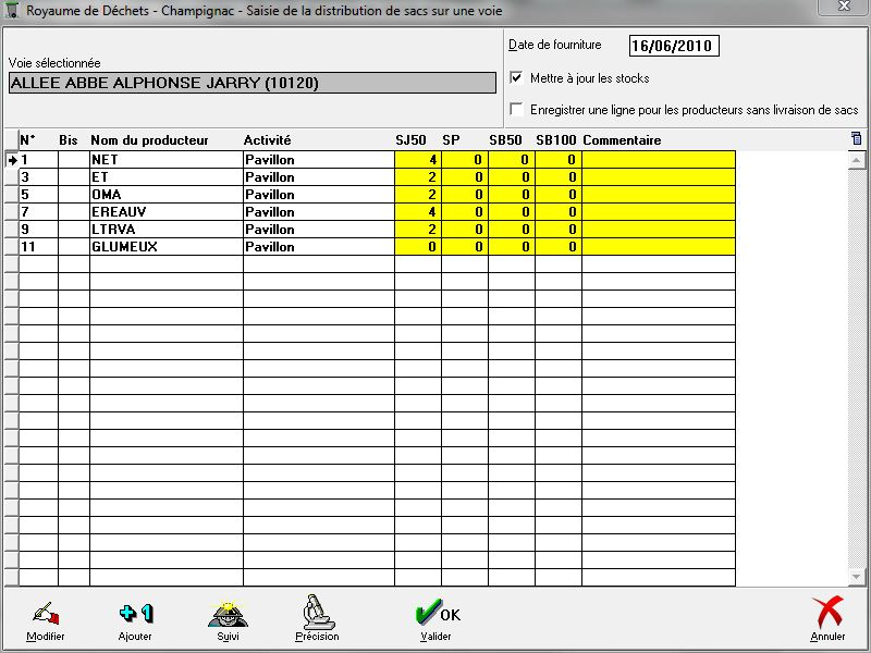 On observe que les allocations de sacs sont préremplies en fonction des règles d'allocation (voir 6.1. Règles d'allocation) afin de faciliter et d'accélérer la saisie. Aucune allocation n'est prévue pour le numéro 11, car lors de la création de l'emplacement, sa dotation en sacs n'a pas été demandée. Il est toutefois possible de saisir des modifications manuellement pour corriger des erreurs ou prendre en compte des cas particuliers.