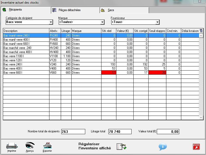 Lorsque le module de gestion des stocks est activé, par défaut, l'ensemble des stocks de récipients, pièces détachées et rouleaux de sacsest à 0. Nous allons procéder à une régularisation d'inventaire pour renseigner les valeurs initiales.