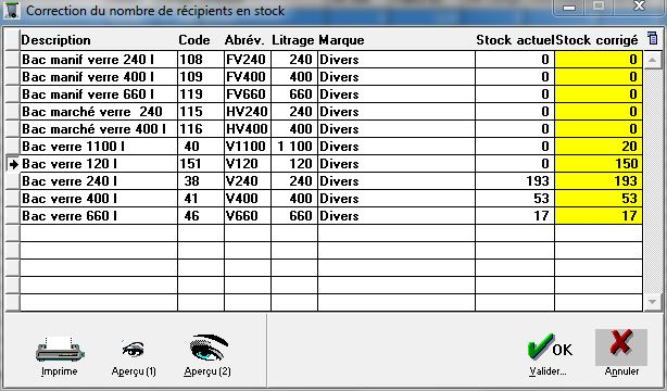 Dans la colonne jaune « stock corrigé », on indique le nombre de récipients en stock 1100 l (20) et de 120 l (150). Pour terminer, clic sur le bouton « Valider » ou raccourci-clavier<Alt><V>.
