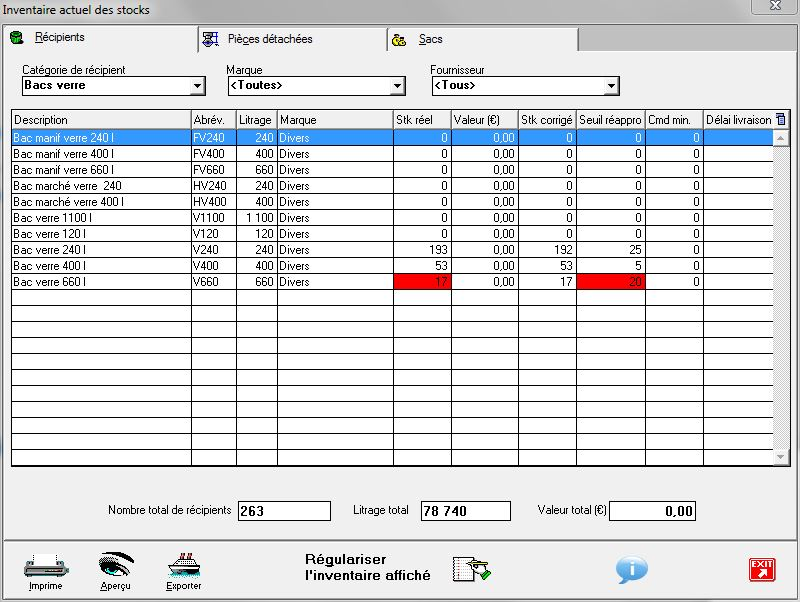 En fonction des items à traiter on choisira l'onglet « Récipients », « Pièces détachées » ou « Sacs »