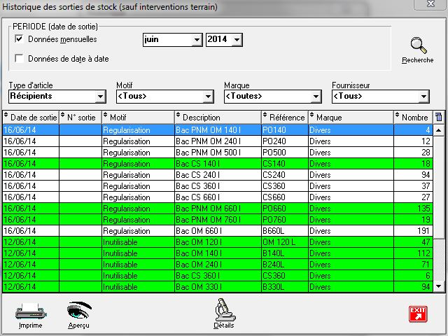 Le module Gestion des stocks tient à jour un historique de toutes les sorties exceptionnelles en stock.