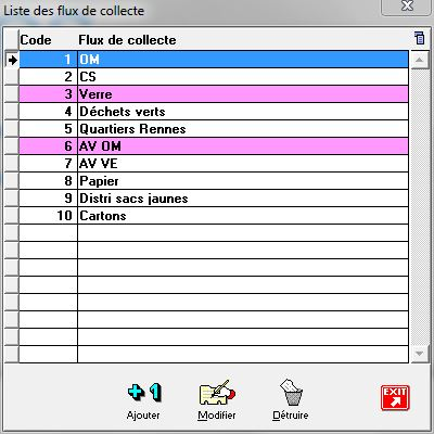 Nous devons tout d'abord créer les flux de collecte. Un flux de collecte correspond au ramassage d'une catégorie de déchet (Ordures Ménagères, Verre, Déchets verts...). Ici, des flux sont déjà définis.
