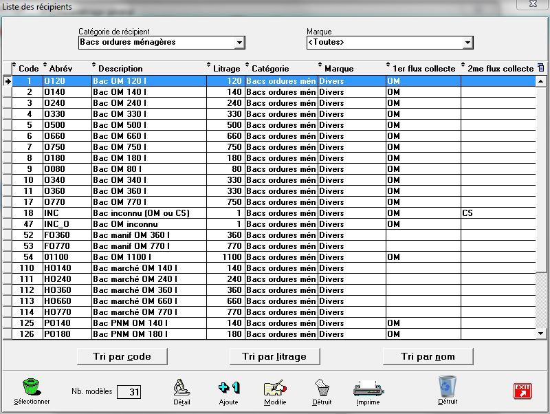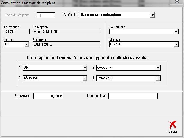 Dans la deuxième colonne en partant de la droite, nous voyons à quel flux de collecte le récipient est associé. Regardons le détail de la fiche du récipient sélectionné (ligne bleue) en double-cliquant (ou clic sur le bouton « Détail » ouraccourci-clavier<Alt><T>) :