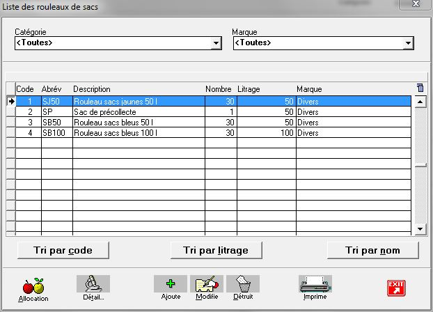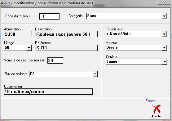 Le flux de collecte associé au type de sac n'est pas précisé ici. Pour le voir Regardons le détail de la fiche du type de sac sélectionné (ligne bleue) en double-cliquant (ou clic sur le bouton « Détail » ouraccourci-clavier<Alt><T>) :